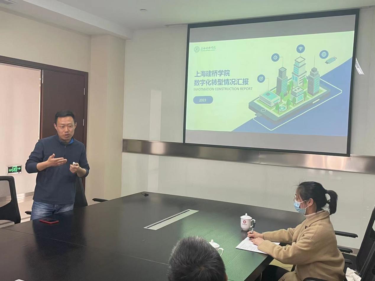 在交流会议上,沈主任对上海建桥学院数字化转型情况进行了展示介绍。沈主任分别从整体架构、网络资源、应用系统、数据治理、信息安全五个方面详细展开,提出了“建设工作平台,打造全校数字基座”的发展思路,目前学校已经形成《上海建桥学院数据标准1.0》建设文档来推进学校建设报表仓库并沉淀核心数据。